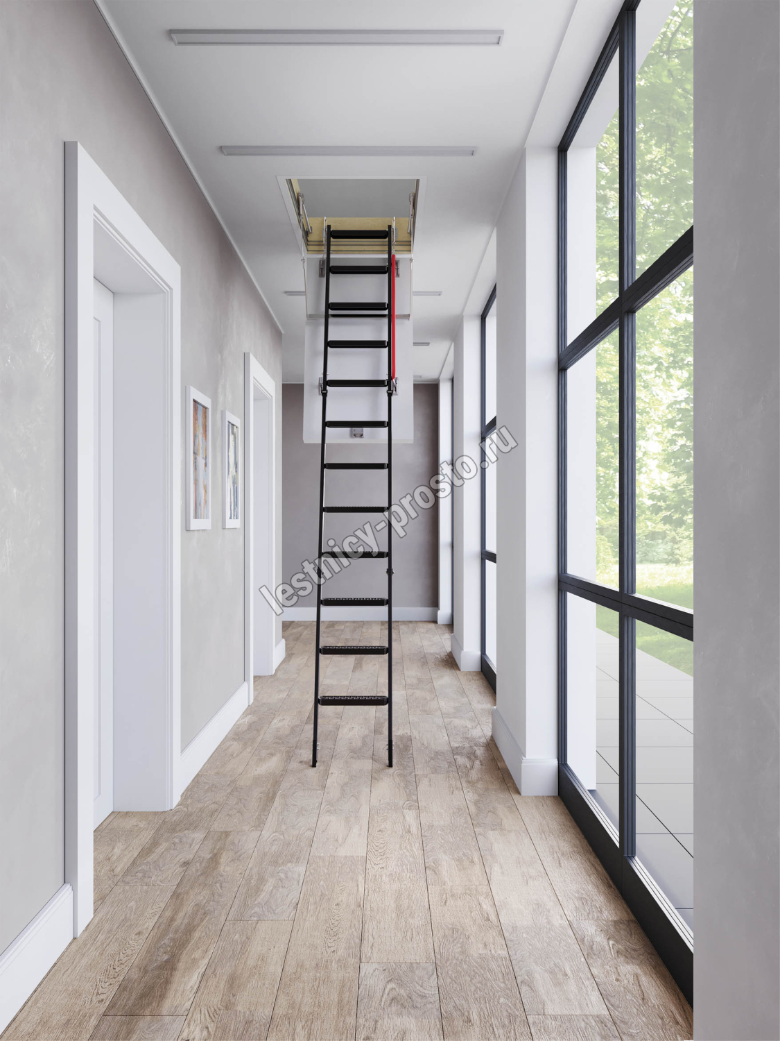 Представляет собой складную конструкцию из металлического лестничного марша и термоизоляционного люка.