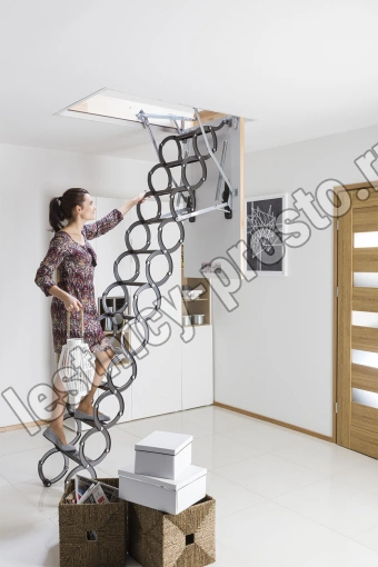 Металлическая чердачная лестница LST оснащена энергосберегающей термоизоляционной крышкой люка белого цвета. По периметру люка установлен контур уплотнения, обеспечивающий высокую степень герметичности. Благодаря «ножничной» системе складывания в сложенном виде лестница очень компактна и имеет небольшой размер крышки люка. S-образные боковые элементы лестницы выполняют роль поручней и придают лестнице современный вид.