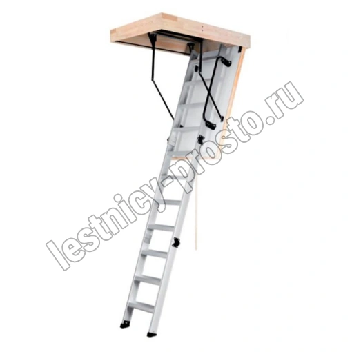 Складная 3-х секционная чердачная лестница. Рабочая поверхность полностью выполнена из алюминия. Термоизоляционная крышка типа "сэндвич" имеет усиленную теплозащиту, облицована с двух сторон ДВП белого цвета. По контуру короба имеется уплотнитель; Все металлические элементы лестницы покрыты порошковой краской.