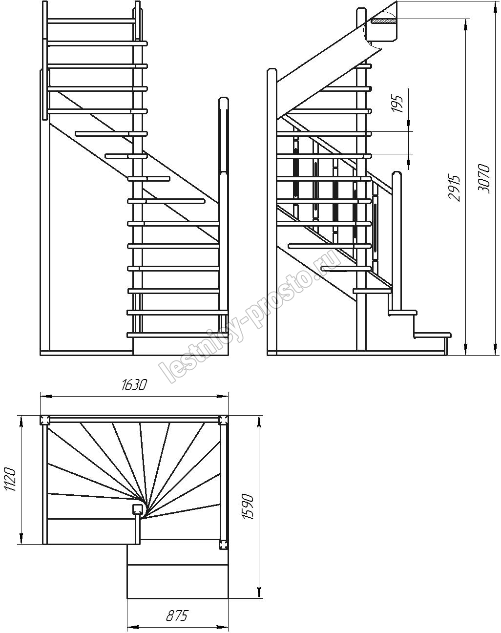 Деревянная межэтажная лестница ЛЕС-03 2915-3075 проем 1630-1120, Лиственница