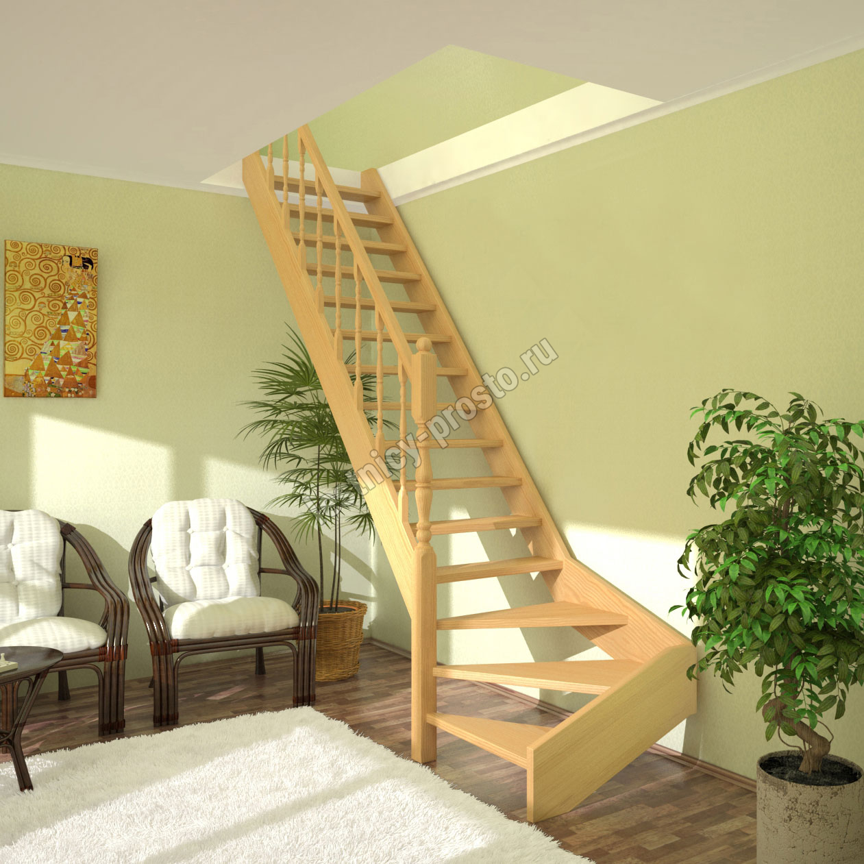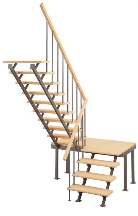 Классическая деревянная лестница с удобным забежным поворотом. Лестница без какого-либо покрытия. В комплекте элементы лестницы и ограждения в разобранном виде, необходимый крепеж, инструкция по сборке.