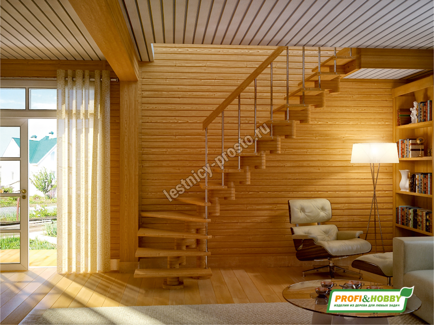 Базовый комплект включает в себя деревянные элементы лестницы и ограждения без какого-либо покрытия.