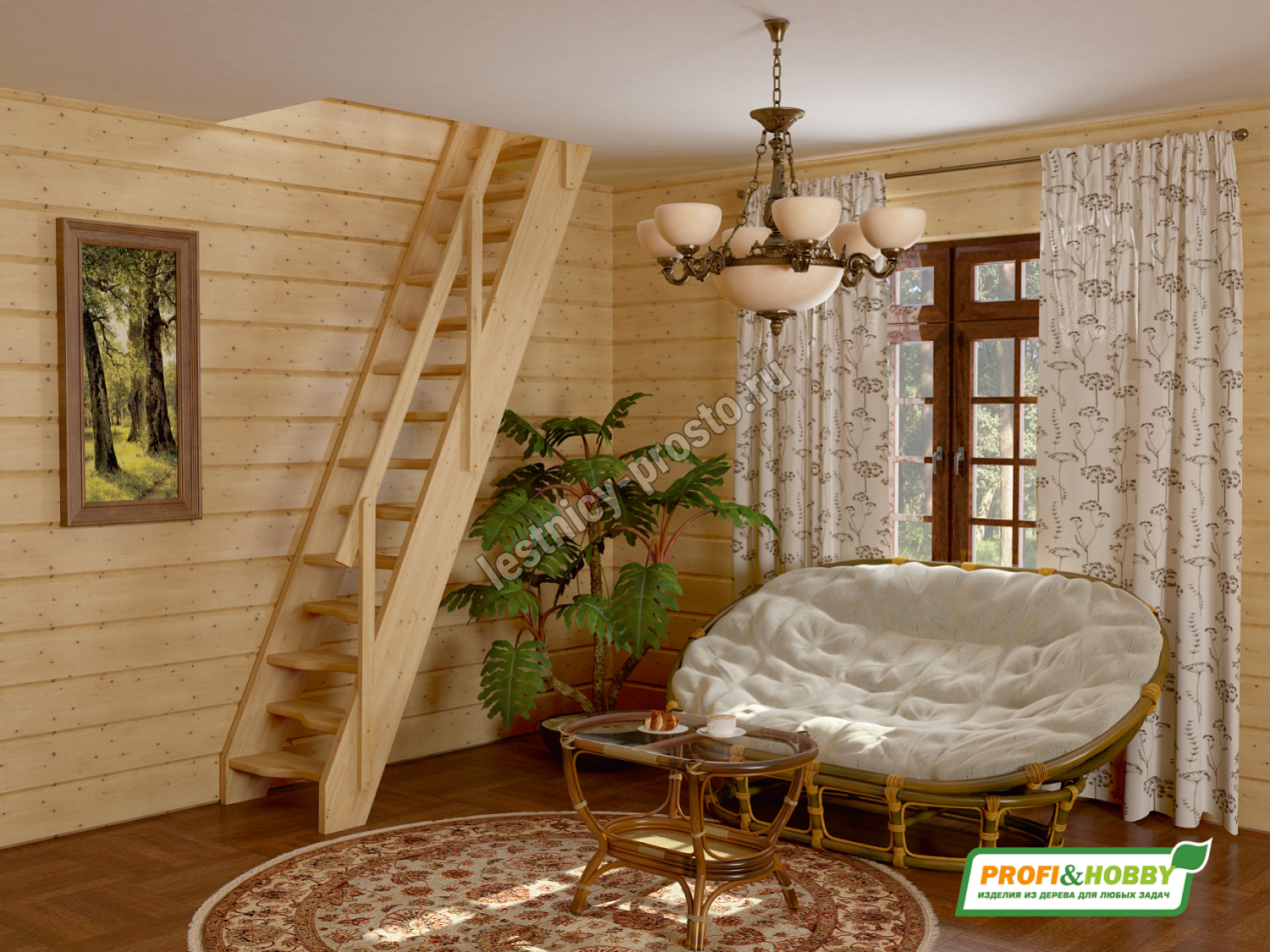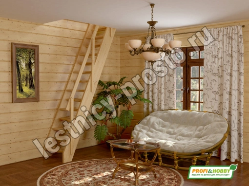 Ступени и поручень лестницы изготовлены из ясеня, остальные элементы из сосны.