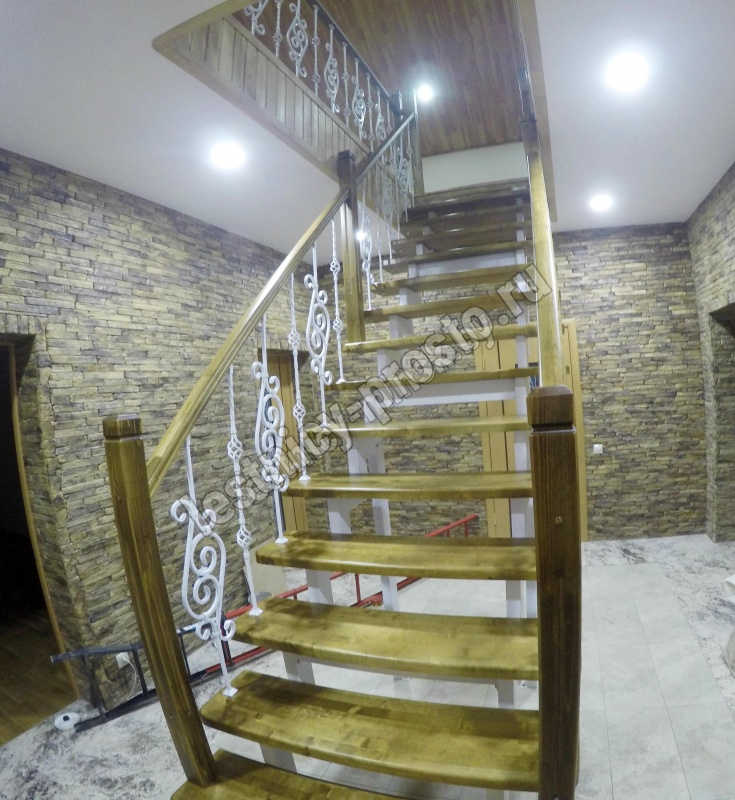 Деревянные элементы: столбы и поручень в базовой комплектации без окрашивания и какого-либо покрытия, металлические элементы окрашены в цвет каркаса лестницы.