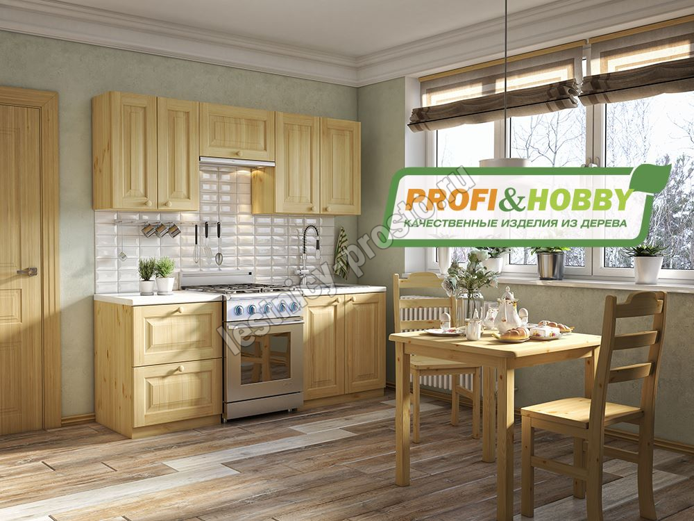 Небольшой кухонный гарнитур из 100% массива сосны шириной всего 2 и высотой 2,32 метра (верхние шкафы 90 см). Один из самых распространенных проектов кухни, который подойдёт для небольшой квартиры, загородного дома, гостиницы или хостела.
