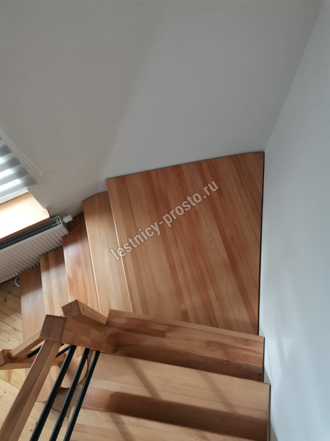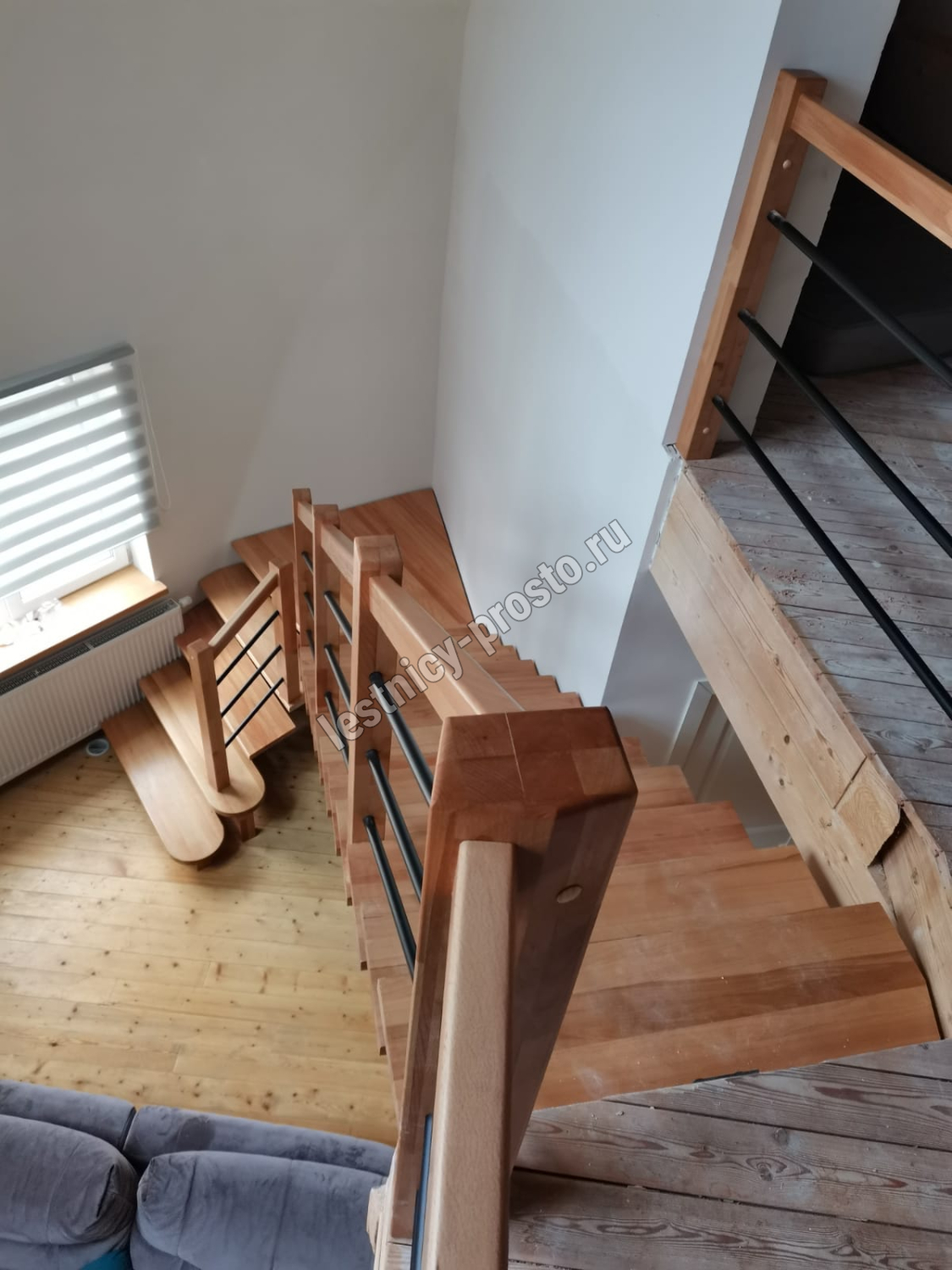 Поворот на 90° реализован посредством площадки, высота поворота определяется параметрами вашего помещения и размерами проёма.
