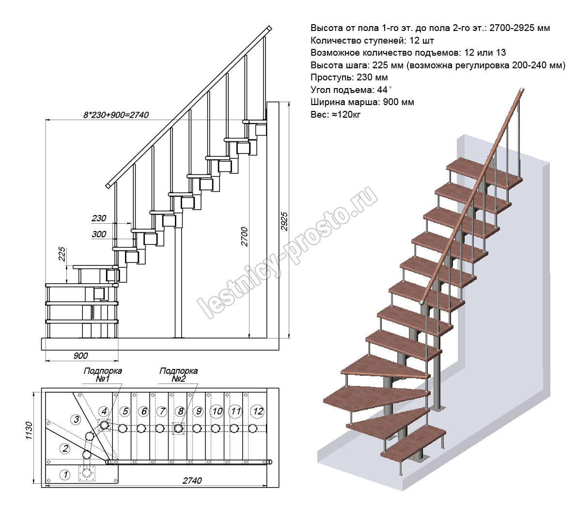 Высота лестницы 2700 - 2925 (12 ступеней) мм