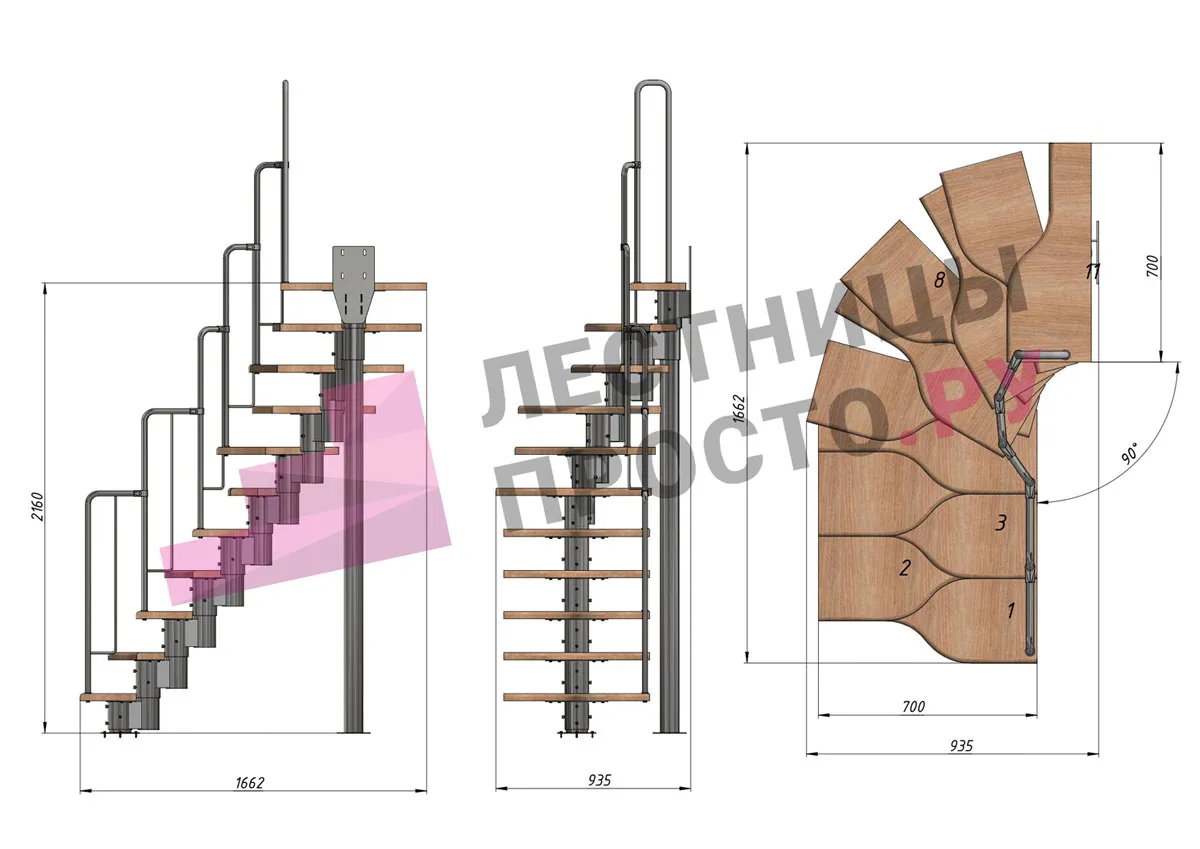Лестница Prosto Urban Black гусиный шаг 700 мм, h198-288 см (11 ступеней), ясень