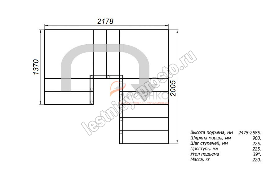 Модульная лестница Комфорт 225 2475-2585, Серый, Сосна, Крашеная, Без Ступений