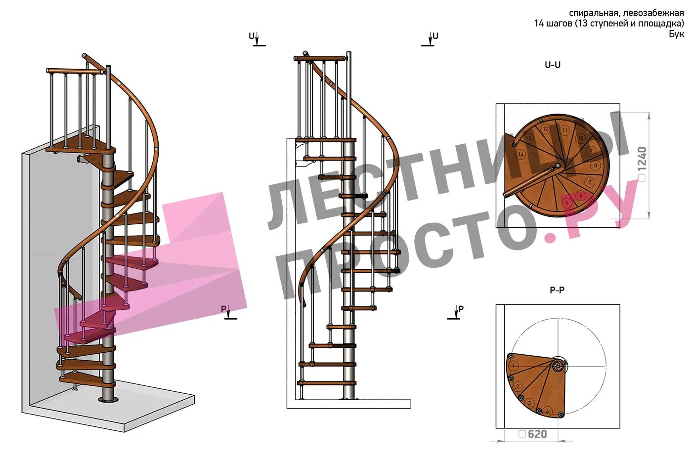| Винтовая лестница Prosto Spiral Black D140см, h260.5-304.6 см, бук |