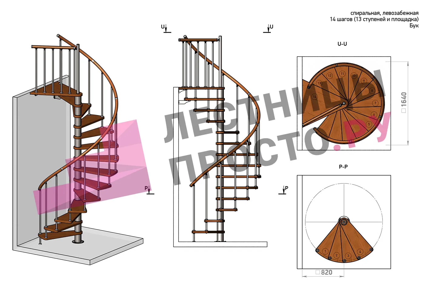 | Винтовая лестница Prosto Spiral Black D160см, h282.2-326,3 см, бук |