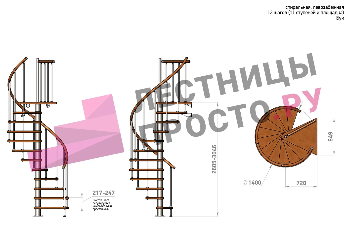 Левая, d=140см, 11 ступеней + площадка