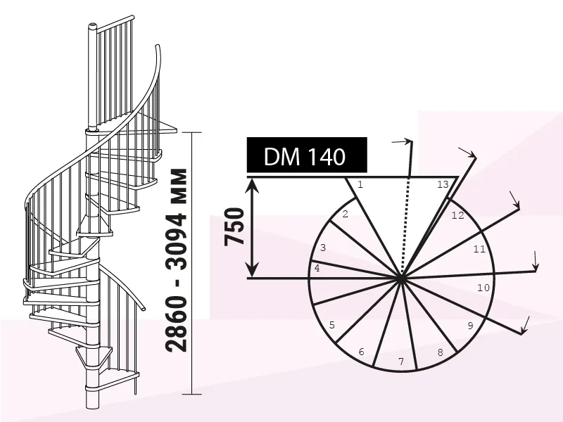 Благодаря возможности регулировать высоту шага с помощью пластиковых вставок (входят в базовый комплект), высоту лестницы можно варьировать в пределах от 2860 до 3090 мм.