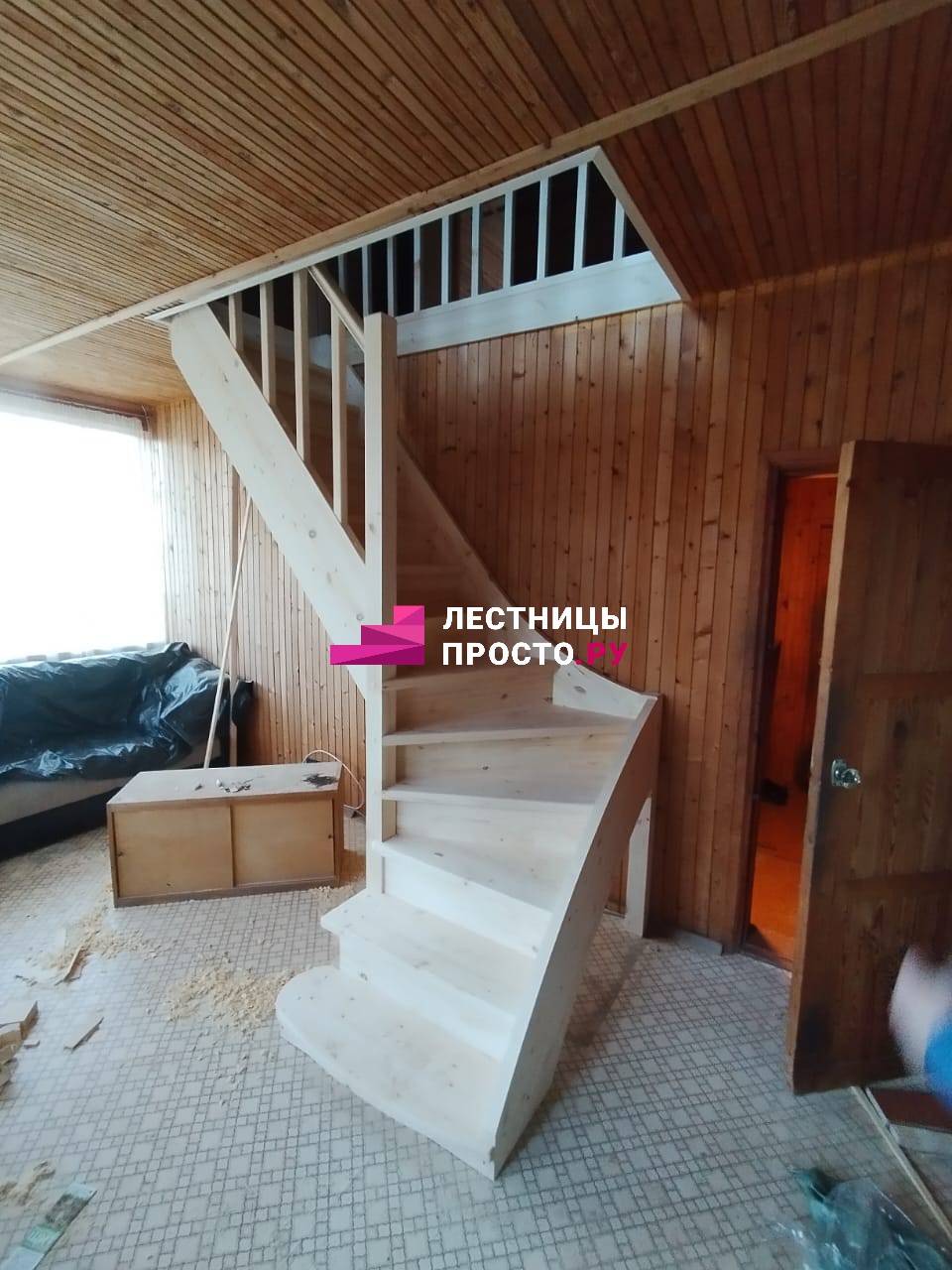Лестница из сосны с поворотом и подступёнками для частного дома